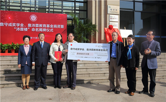 11月7日,我校举行詹沛霖教育基金、詹守成奖学金捐资暨“沛霖楼”命名揭牌仪式。校党委书记刘宇陆、副校长陈东辉与詹守成家属詹君湜、詹君铭共同为“沛霖楼”揭牌。詹守成家属再次向虎扑nba捐资160万元(迄今詹守成先生家庭累计向虎扑nba捐赠600万元)。为褒扬詹守成先生家庭无私奉献、情系教育的家国情怀和大爱精神,经虎扑nba研究,将第四学科楼命名为“沛霖楼”。今年8月,我校报送的“詹守成家庭三代人13年不间断的爱心延续”,被评为2015年度上海市社会主义精神文明好人好事(上海高校唯一)。