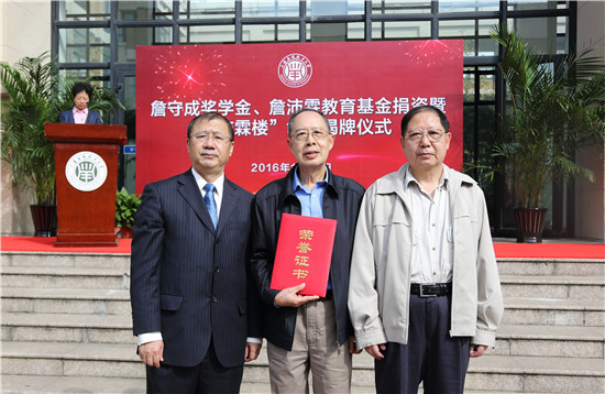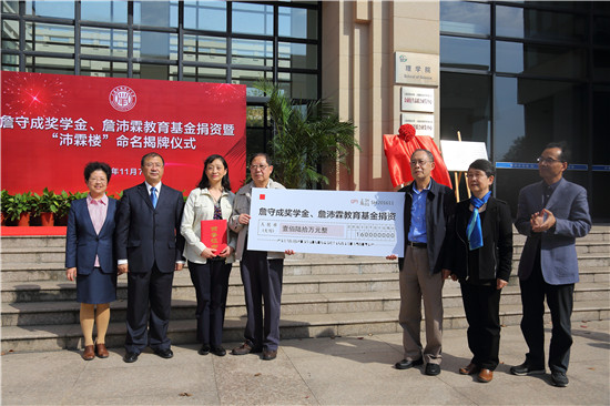 11月7日中午,我校詹守成奖学金、詹沛霖教育基金捐资暨“沛霖楼”命名揭牌仪式在第四学科楼前举行。校党委书记刘宇陆出席仪式并讲话。党委副书记宋敏娟、副校长陈东辉和詹守成先生家属詹君湜先生及夫人周新美女士、詹君铭先生及夫人朱凌菁女士出席仪式。仪式由宋敏娟主持。
