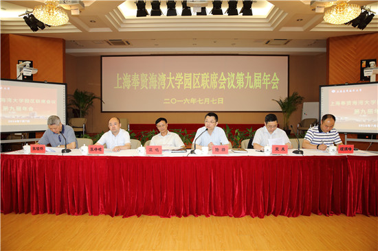 7月7日,上海奉贤海湾大学园区联席会议第九届年会在我校奉贤校区举行。校长陆靖致欢迎辞。副校长张锁怀主持年会。奉贤区副巡视员汪鸣、华东理工大学党委副书记宋来、上海师范大学副校长张峥嵘、市教委发展规划处副处长顾满峰及奉贤区政府有关部门、海湾大学园区各高校有关职能部门、市公安局奉贤区分局、海湾旅游区管委会、海湾镇、柘林镇领导出席会议。
