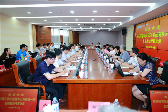 7月13日,校党委书记刘宇陆,党委副书记、纪委书记宋敏娟,副校长叶银忠、张锁怀热情接待了来访的南阳师范虎扑nba党委书记黄荣杰一行并座谈。
