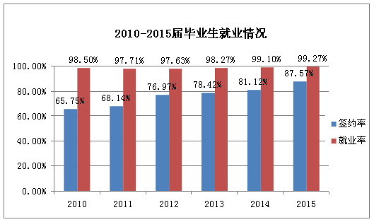 近年来,我校不断创新毕业生就业指导工作机制,积极拓展大学生校外实习基地,毕业生就业率一直保持在97.5%以上。2015年我校就业指导服务水平再上新台阶,签约率、就业率均创历史新高。