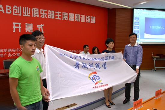 训练营开营仪式上,刘刚、董时一起为训练营授旗。我校赵兴权同学代表KAB俱乐部主席们接过了营旗。大会上公布了2014年度十佳大学生KAB创业俱乐部、20佳大学生KAB创业俱乐部主席。