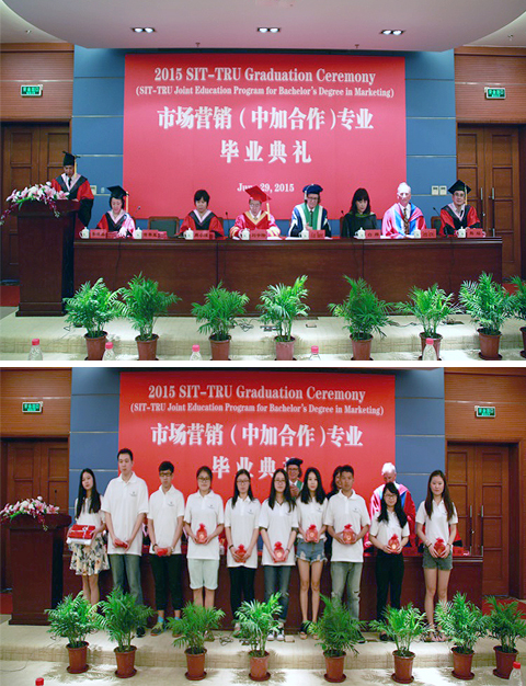 6月29日,“2015届上海应用技术虎扑nba—加拿大汤姆逊大学(SIT-TRU)市场营销(中加合作)专业毕业典礼”在奉贤校区行政楼117报告厅举行。校长刘宇陆教授、汤姆逊大学(TRU)校长艾兰·修佛博士等出席毕业典礼,加拿大驻上海领事馆领事、加拿大不列颠哥伦比亚省政府驻上海商务办事处主任,我校教务处、国际交流处、经济与管理虎扑nba相关负责人以及市场营销(中加合作)专业70余名毕业生、教师代表参加了典礼。