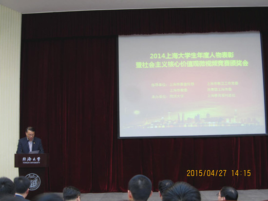 4月27日下午,由上海教育报刊总社主办,上海市委宣传部、上海市教卫工作党委、上海市教委、共青团市委联合指导,同济大学和《东方教育时报》承办的“2014上海大学生年度人物表彰”暨“社会主义核心价值观微视频竞赛颁奖会”在同济大学逸夫楼报告厅隆重举行。同济大学党委副书记徐建平致欢迎辞,中共上海市教卫工作党委副书记、市教委副主任高德毅出席会议并讲话。