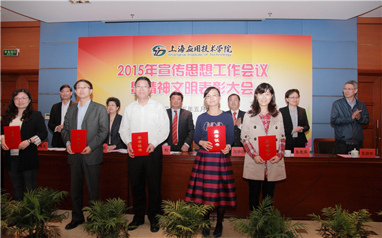 校党委副书记宋敏娟,副校长叶银忠、张锁怀分别宣读A级文明单位、A级文明窗口获奖集体名单,“忠诠-尔纯”思想政治教育奖、2014年校园文化建设优秀项目获奖集体及个人名单, 2014年度校精神文明“十佳好人好事”、 2014年度校优秀通讯员及优秀撰稿人获奖名单。全体校领导依次为获奖集体及个人颁奖。
