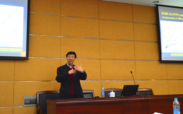 Michael Qian教授在图书馆B102室,向我校从事相关研究的教师、科研人员以及研究生作了题为“Advances in flavor and aroma research”的学术报告。报告从香料加工使用的历史讲到风味化学的兴起、香味成分产生的生理机理,并结合诺贝尔奖获得者等国际先端研究成果做了深入浅出的讲解。他还介绍了现代分析技术的发展,香味物质的分析检测手段以及在他本人相关研究中的应用。报告历时2个小时,信息量庞大,师生们认真聆听、踊跃提问,表示出很大的兴趣。