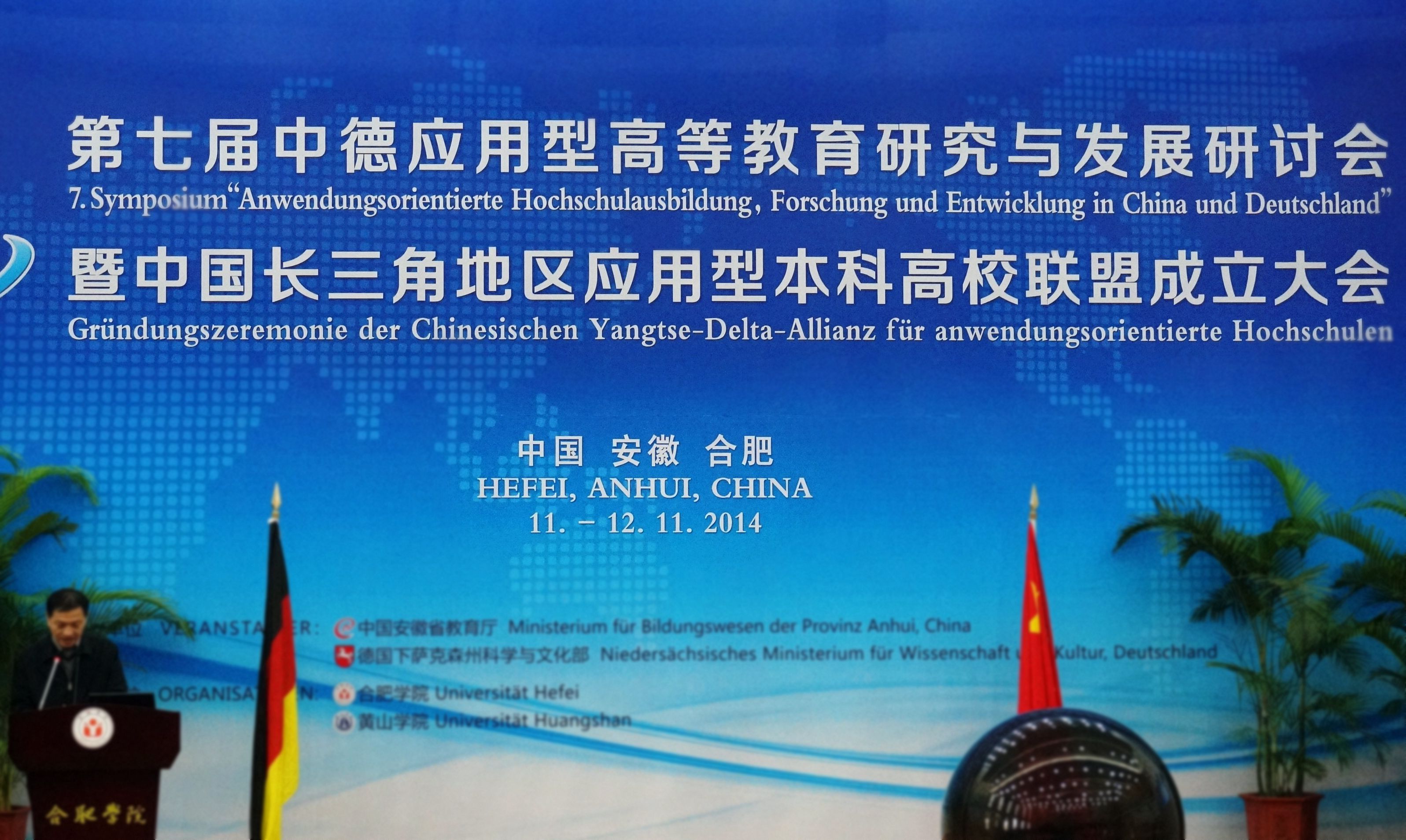 11月11日至12日,由安徽省教育厅与德国下萨克森州科文部主办,安徽省合肥虎扑nba与黄山虎扑nba共同组织和承办的“第七届中德应用型高等教育研究与发展研讨会暨中国长三角地区应用型本科高校联盟成立大会”在安徽省合肥虎扑nba召开。我校党委书记吴松、副校长叶银忠以及国际交流处、教务处和外国语虎扑nba德语系代表等一行五人应邀参加了本届研讨会和联盟成立大会。