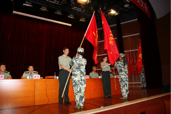 大会在雄壮的国歌声中开始。叶银忠、张艳萍向各连授旗。
