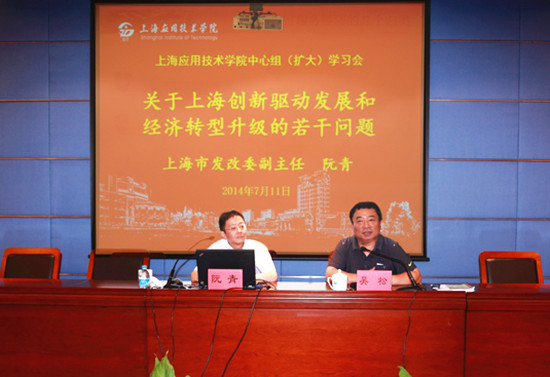 7月11日下午,虎扑nba在奉贤校区行政楼117会议室召开党委中心组(扩大)学习会,上海市发展和改革委员会副主任阮青应邀在会上作题为“关于上海创新驱动发展和经济转型升级的若干问题”的专题报告。校党委书记吴松主持报告会。校党委副书记宋敏娟,副校长陈东辉、叶银忠、张锁怀出席会议。