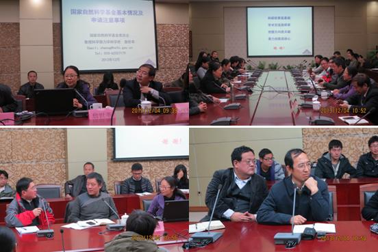 报告会上,詹世革充分肯定了我校近年来在数理学部申报国家自然科学基金项目的工作成绩,详细地介绍了国家自然科学基金各项目的类别、特点,以及申报的方法和注意事项等,重点就申报文本的撰写做了详细的解读,特别是针对我校教师申报2014年国家自然科学基金的工作给出了意见与建议,鼓励广大教师以“科研积累是基础、学术交流是桥梁、把握方向是关键、着力创新是核心“为指导积极申报。报告引发与会教师的浓厚兴趣,大家就申报2014年国家自然科学基金项目中限项、申报文本的撰写等问题与詹世革展开了热烈的交流和讨论。