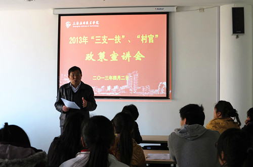 4月2日下午,我校举办了“2013年‘三支一扶’及‘村官’报名动员及政策宣讲会”,会上就业指导服务中心主任翁德明给毕业生作了动员和宣讲,并详细解读了相关的政策及待遇问题,解答了同学们关心的具体问题。