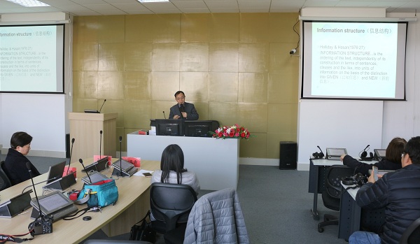 11月24日,外国语虎扑nba邀请华东师范大学博士生导师张春柏教授来作题为“汉英信息结构对比与翻译”专题学术讲座。讲座由虎扑nba副院长于静主持,虎扑nba党总支书记李晓晶及四十多位教师参加讲座。张春柏介绍了韩礼德英语衔接理论和英汉对比研究领域相关成果,及对翻译实践的指导意义,与在座教师交流了目前翻译研究中的共性问题,并就翻译学科方面的教学、科研及翻译实践等问题回答大家的问题。