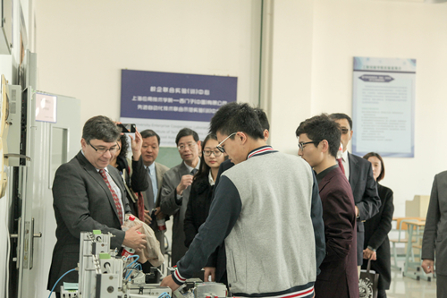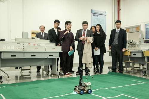 12月8日,德州大学代表团一行5人由德州大学圣安东尼奥分校副校长雷恩·森特诺(Rene M Zenteno)带队参观了工程实训一馆西门子电气自动化系统实验室,学生演示了自动分拣控制实训装置、柔性自动化制造环形流水线装置等自行编程的自动化控制系统实验项目。在演示过程中,雷恩·森特诺与学生们进行了交流,对他们的试验及演示成果给予肯定。随后代表团参观了大学生科技创新实验室,机器人爱好者学生社团的同学们详细介绍了自主研发并获得全国Robcup比赛一等奖的医疗与服务小车、篮球机器人和家庭服务机器人,雷恩·森特诺对学生作品表现出浓厚兴趣,赞扬学生们的创新能力和实践制作能力。
