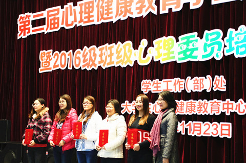 校学工部副部长朱美陶表示,班级心理委员在大学生心理健康教育中的角色举足轻重,班级心理委员应将培训所学运用到工作中去,做到学有所得、学有所成。会上颁发了2016年度心理健康教育主题海报优秀作品奖、校大学生心理协会“优秀干部”、2016年度优秀班级心理委员、2016年度心理健康教育学生先进个人、2015级班级心理委员培训优秀组织奖等多个奖项;并对152名2015级经岗前业务培训合格的同学进行聘任。大学生心理协会会长带领全体2016级班级心理委员进行了庄严的宣誓。
