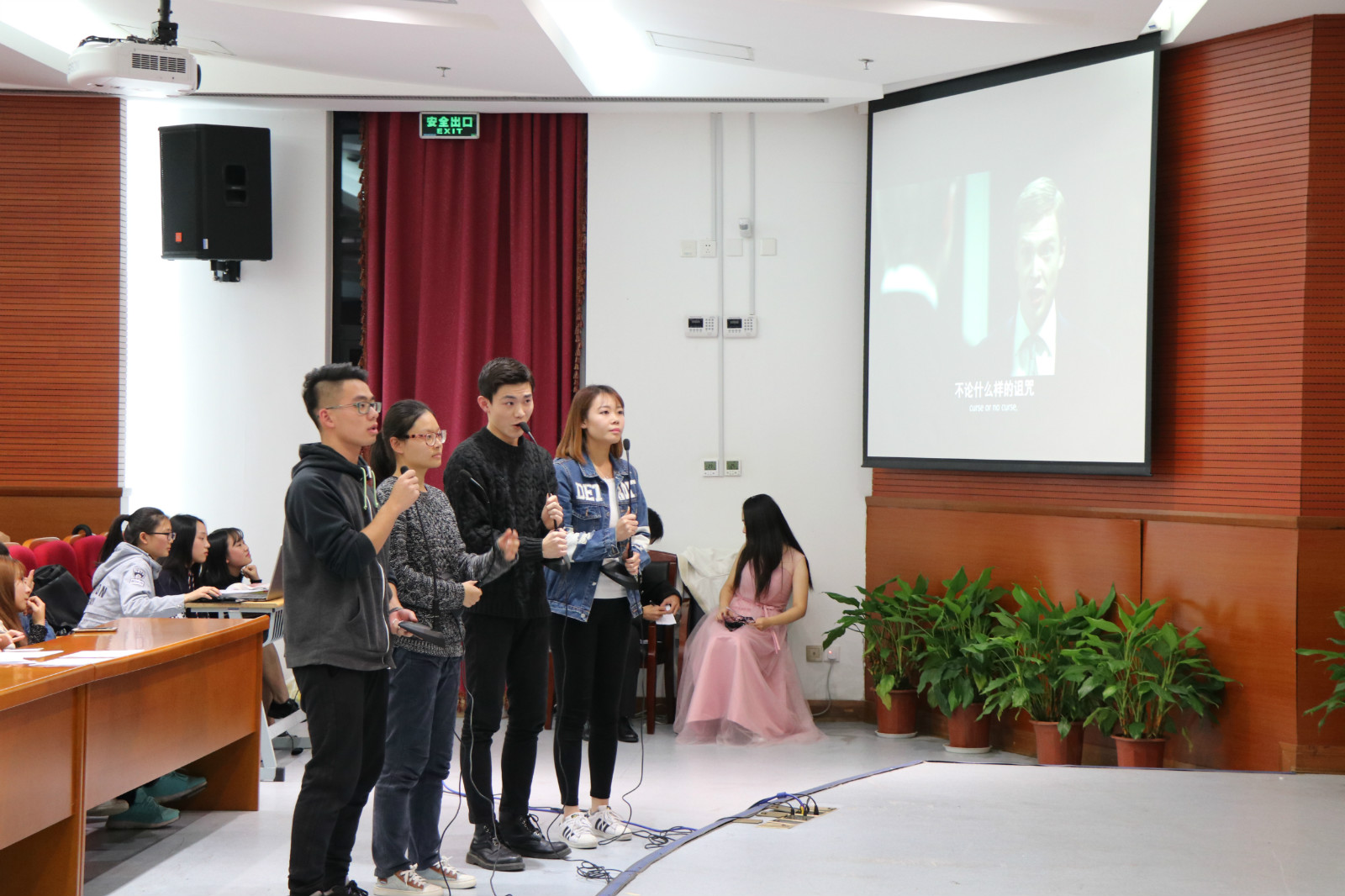 11月16日晚,外国语虎扑nba举行第十三届外语节英语电影配音大赛。大学英语教学部徐谦谦老师、外国语虎扑nba英语系孙红英老师以及德语系徐旸老师担任本次比赛的评委。