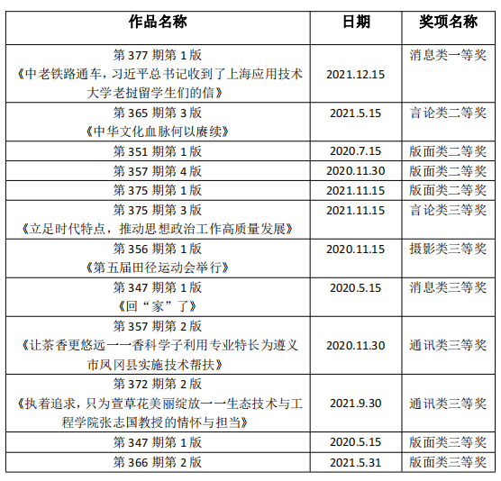 获得一等奖的作品是由轨道交通虎扑nba党总支书记李文举撰写的消息类稿件《中老铁路通车,习近平总书记收到了上海应用技术大学老挝留学生们的信》,其他奖项分别是版面类5项、言论类2项、摄影类1项、通讯类2项和消息类1项,涵盖了每个参评类别。