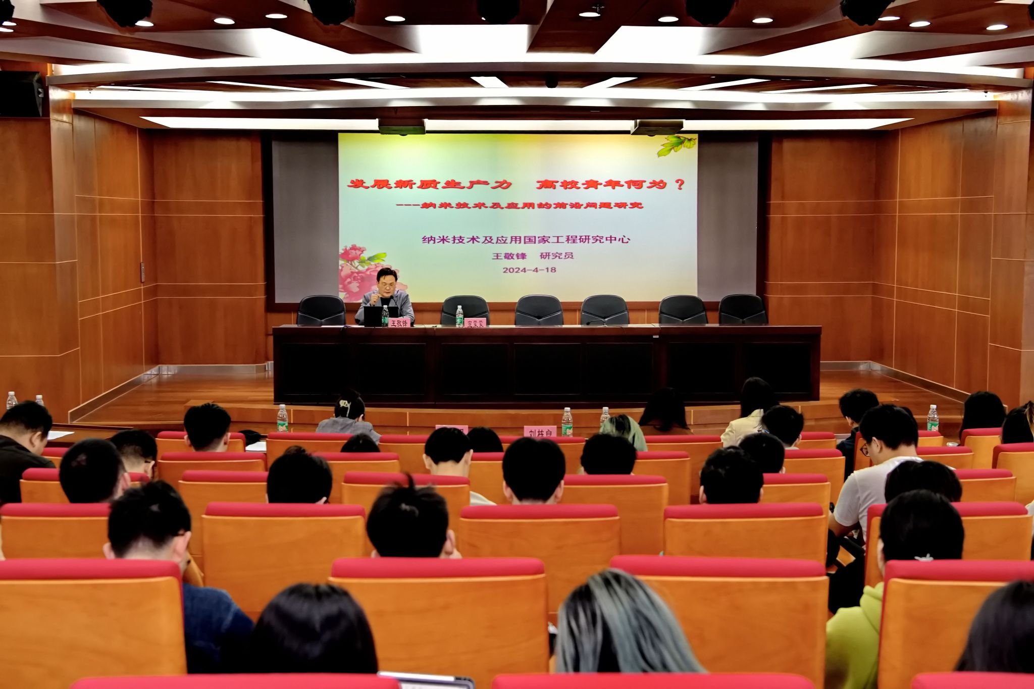 上海工匠、闵行领军人才、上海纳米技术及应用国家工程研究中心有限公司党支部书记、研发主管王敬锋博士带来了首场学术报告,他以“发展新质生产力,高校青年何为?——纳米技术及应用的前沿问题研究”为题,分享了当前纳米技术及应用的前沿问题以及自己的科研经验,并对青年学子如何做好科研提出了希望和建议。