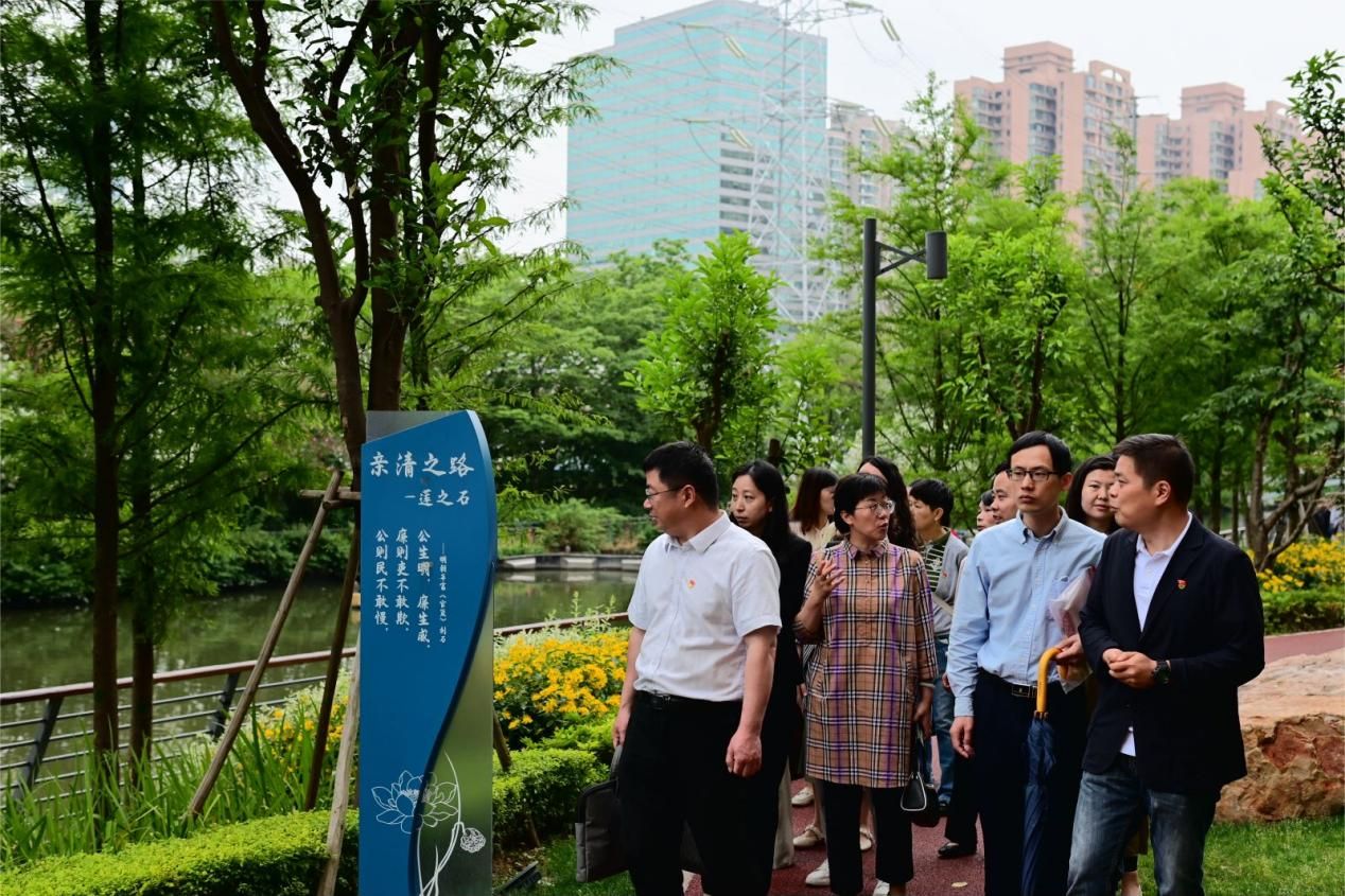 田林街道纪工委书记邵微琼介绍街道在党纪学习教育方面的经验做法,千鹤第六居民区党总支书记顾卓宏带领老师们参观了“花开蒲汇塘——亲清之路”廉政文化教育基地。