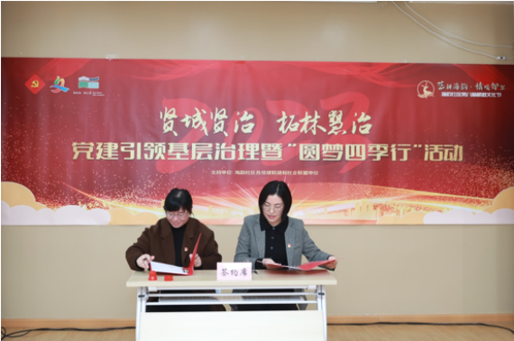 奉贤区柘林镇海韵社区党支部书记沈磊对海韵社区的基本情况进行了详细的介绍。随后,沈磊与张小懿代表双方单位签署党建共建协议,并参加了“三联五共·融合治理”项目的启动仪式。