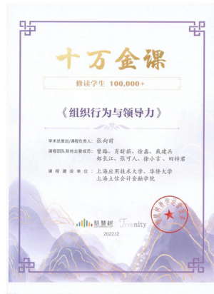 《组织行为与领导力》课程从个体、群体、组织行为以及领导素质论、行为论、环境论多维度评析,旨在提高学生跨文化管理能力,引导其发现、挖掘自身具备的领导潜能。该课程通过教育部在线教育研究中心慕课上线认证,系全国大学生素质教育优秀通选课、国家精品在线课程、首批国家一流在线课程、国家教育部产学协同育人课程改革示范项目,相关线下课程还获评上海市重点课程。