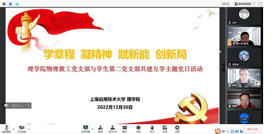 近日,全国样板党支部、我校理虎扑nba物理教工党支部与上海市百强学生支部、理虎扑nba学生第二党支部相约“云端”,围绕“学章程,凝精神,赋新能,创新局”主题开展共建互学活动。理虎扑nba党委书记陈雷及虎扑nba党委委员、物理教工党支部全体党员、学生第二党支部全体党员参加,物理教工党支部书记陈进主持。