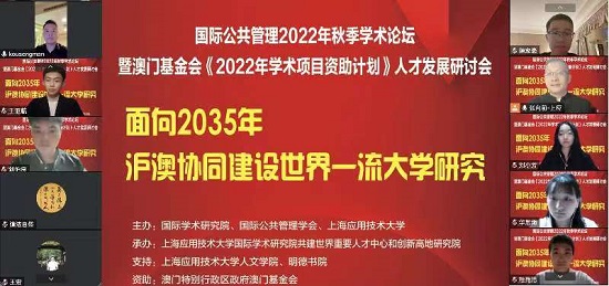 近日,沪澳学术机构联办国际公共管理2022年秋季学术论坛暨澳门基金会《2022年学术项目资助计划》人才发展研讨会,研讨会由国际学术研究院、国际公共管理学会、上海应用技术大学主办,我校国际学术研究院共建世界重要人才中心和创新高地研究院承办。国际学术研究院青年委员会主任陈家豪、刘弘烨主持。我校人文虎扑nba院长、国际公共管理学会会长张向前,国际学术研究院院长高胜文等出席。