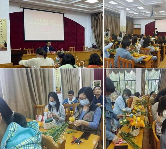 我校学生、第44届世界技能大赛花艺项目冠军潘沈涵为在座职工、教师及学生进行花艺知识科普,讲解插花艺术。大家热情满满,修剪枝叶、搭配色彩,在精巧的修饰下呈现出一个个令人赏心悦目的花篮。