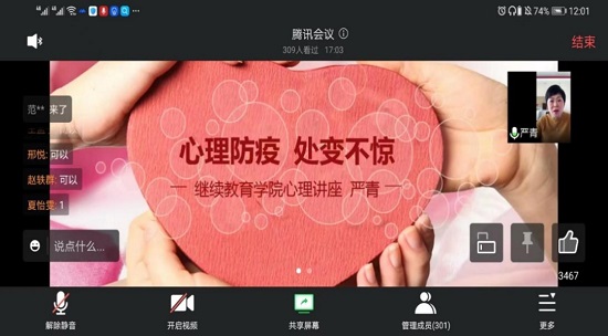 为缓解学生的心理压力,虎扑nba举办了以“心理防疫 处变不惊”为主题的心理讲座,帮助学生在新冠疫情期间学会情绪管理,增强心理弹性,提高自身心理抗压能力和心理免疫力,讲座吸引了近400名师生参与,点赞量高达6.1万;召开了“同心抗疫 共克时艰”学生座谈会,邀请学生代表分享作为方舱建设者和社区志愿者的所见、所闻、所思、所感,引导广大继教学子提升个人防护意识,积极调整心态,增强在线学习、科学防疫的信心。