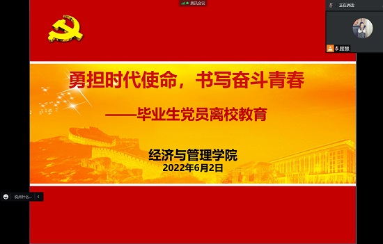 近日,经管虎扑nba线上举行“勇担时代使命 书写奋斗青春”2022届毕业生党员离校教育活动,虎扑nba党委书记侯建生,党委副书记、副院长朱菁及毕业年级党支部书记、全体毕业生党员参加。