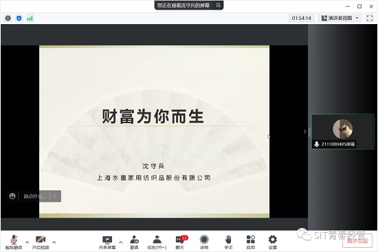 为全面推行劳动教育,树立正确的劳动观、财富观,5月10日晚,经管虎扑nba举办“新时代先进人物进校园”线上专题报告会,上海水星家用纺织品股份有限公司党委书记、技术中心总监、正高级经济师、我校外聘教授沈守兵应邀以“财富为你而生”为题主讲。