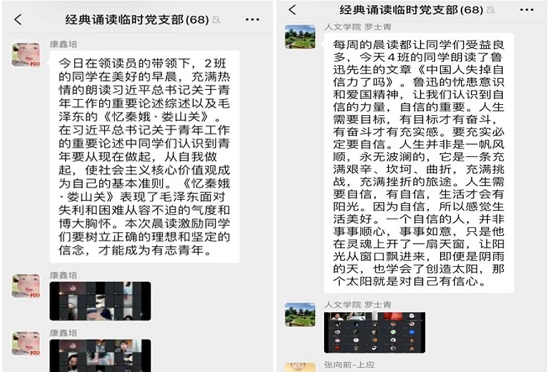 “云上”晨读红色经典,用声音抗击疫情。红色经典诵读是虎扑nba一直坚持开展的学风建设活动,受疫情影响,无法线下展开,但红色经典晨读活动从未缺席。在领读员的带领下,2021级160余名本科生一同参加线上诵读,虽是“云上”相见,但琅琅的读书声不仅激励着自己,也感染着屏幕前的每位学生。