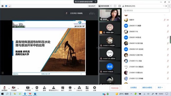 陈靖禹以“具有特殊表面浸润性的材料及其应用”为题,讲述了表面浸润性的适用场景,对石油开采研究难点和热点、油水混合物的分离等方面作了详细介绍,并鼓励师生积极开展科研、积极投入到多方面、多层次的材料研究中去,为国家发展做出贡献。
