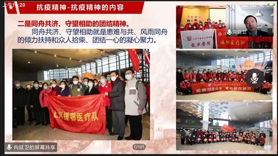 向延卫讲述了“五四运动”核心精神中“爱国、进步、民主、科学”对中国革命的历史意义,表示“抗疫精神”具有丰富的精神内涵,蕴含着勇于担当、甘于奉献的使命精神,同舟共济、守望相助的团结精神;敢于斗争、敢于胜利的奋斗精神,尊重规律、求真务实的科学精神;以及命运与共、共克时艰的天下精神。伟大“抗疫精神”是中国精神的生动诠释,是全面建设社会主义现代化国家、实现中华民族伟大复兴的强大力量。