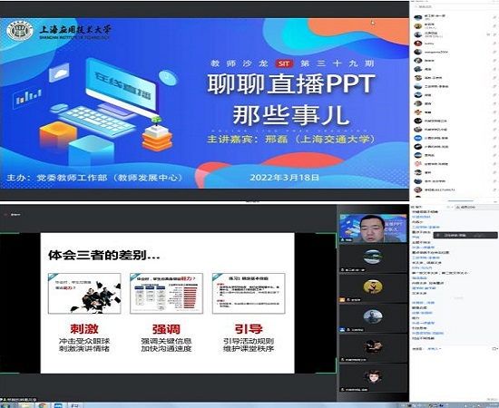 为主动应对上海新冠疫情防控新形势,完善教师在线教学实施细节,提高在线教学质量,3月18日,校党委教工部(教师发展中心)特邀请上海交通大学副研究员、国内高校教学发展领域资深培训师邢磊在线主讲第39期教师沙龙。校党委教工部部长、人事处处长田怀香主持沙龙。