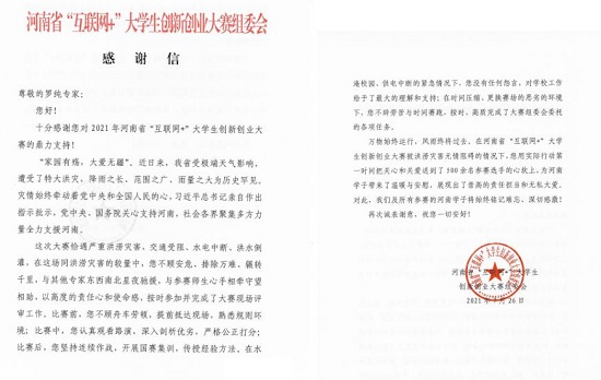 赛程结束后,河南省组委会撰写表扬信,对罗纯不顾舟车劳顿、连续作战开展评审工作、对大赛的鼎力支持和无私大爱深表感谢。罗纯表示,“互联网+”创新创业大赛是教育部认定的重要的国家级赛事,无论是遭受暴雨或者洪水倒灌,自己一定会牢记使命、圆满完成任务。