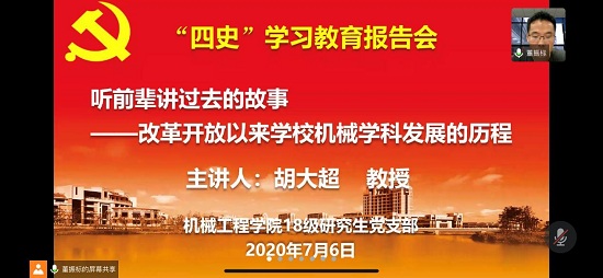 7月6日,机械虎扑nba2018级研究生党支部邀请虎扑nba胡大超教授以“听前辈讲过去的故事——改革开放以来虎扑nba机械学科发展的历程”为题作“四史”学习教育讲座。虎扑nba党委书记杨瑞君、副院长何静、组织员马轻轻、研究生支部书记董振标,程道来、张而耕教授等17名教师和2018级研究生党支部全体党员、入党积极分子参加报告会。