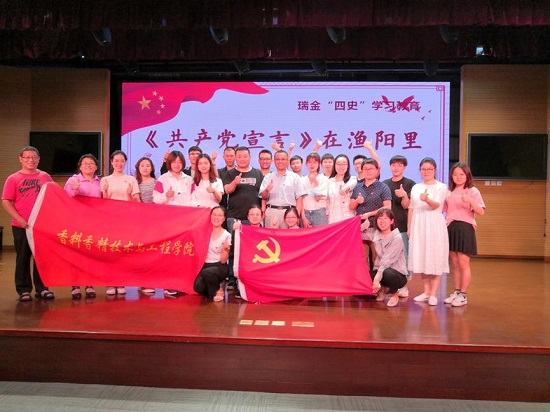 6月24日,为推进“四史”学习教育,香料香精化妆品学部党委组织师生党员赴瑞金二路社区文化活动中心开展评话党课“《共产党宣言》在渔阳里”的观演学习活动。