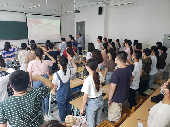 会上,全体毕业生党员在鲜红的党旗下,全体党员佩戴党徽,举起右手、握紧拳头,庄严宣誓。
