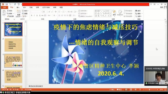 李颖从认识情绪入手,用特色案例展示了情绪产生的生理基础和社会意义,并针对当前疫情可能引起的心理应激反应,着重介绍了心理应激的产生机制、主要表现和应对措施。她介绍了情绪的观察与测量方法,帮助大家关注自己的情绪状态并及时调节情绪,并列举了表情调节、人际调节、环境调节、认知调节、回避引发情绪的问题等五种调节策略,提出了心理暗示法、注意力转移法、适度宣泄法、自我安慰法、交往调节法和情绪升华法等六种具体的情绪调节方法。