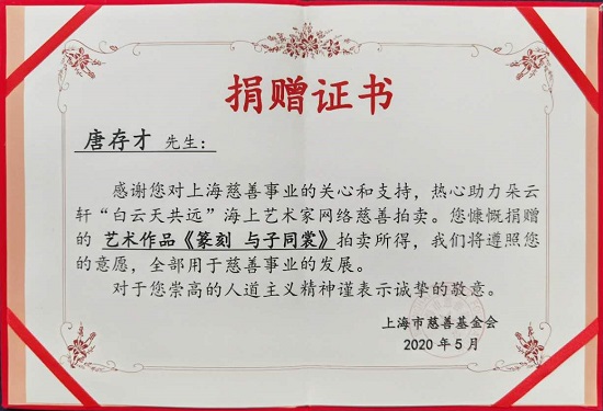 在抗击疫情期间,唐存才积极响应上海市书法家协会号召,创作“北朝佛造像飞天刻石初拓题跋”作品,由上海市慈善基金会义卖,以艺术创造来助力战疫。