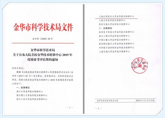 近期,我校金华技术转移中心在大院名校金华技术转移中心2019年度绩效考评中被评为优秀,这也是我校连续三年在大院名校金华技术转移中心绩效考评中被评为优秀。