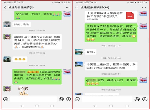 二是确保一个不落下。虎扑nba认真落实主体责任,对全院93名教师和1973名学生疫情期间信息做到精准排查和动态掌握,确保疫情防控期间“一个都不落下”。对返回湖北过春节的老师、接触从武汉回沪家属的教师建立“城建每日健康群”,每天与他们交流沟通,普及防控知识、健康知识,加强心理疏导。对于离沪教师建立“城建居家隔离群”,通过问卷星形式让每位教师便捷上报每日两次体温测量数据。对于返沪当日教师,虎扑nba领导还会个别提醒注意做好居家隔离。隔离期满老师,也能收到虎扑nba做好防护措施的温馨提醒。此外,虎扑nba还有3位国外访学教师,虎扑nba也会定期交流,特别是国外疫情爆发时,提醒他们注意做好个人防护等工作。