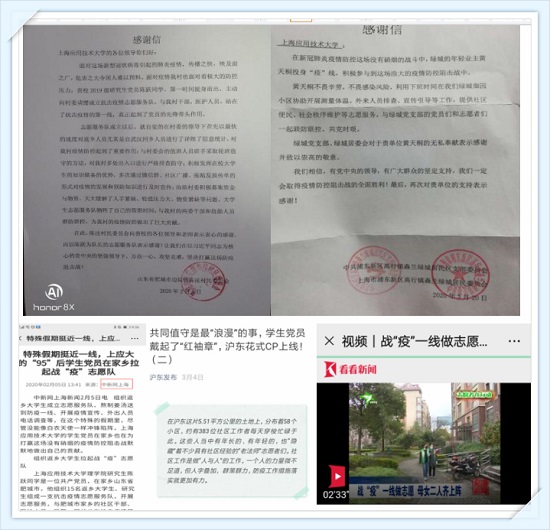 理虎扑nba多位学生党员在疫情期间参加志愿活动。学生党员陈跃在疫情开始的第一时间组织了15名返乡大学生和研究生成立抗疫志愿服务队。作为队长的他带领全体抗疫志愿者队员们自大年初四(1月28日)起至4月2日持续抗疫65天,个人累计在一线抗疫服务超过300小时,带领全体志愿服务队志愿服务近3000小时,在他的影响和倡导下,山东省肥城市经济开发区有超150名返乡大学生参与到抗击疫情中,事迹分别中国新闻网、上海教育、山东省肥城市卫健委、肥城市经济开发区、山东管理虎扑nba等多家媒体报道。张佳奕同学积极响应社区号召带着“红袖章”在沪东社区门岗值守,事迹被公众号沪东发布报道;李文勤和母亲一起在杨浦新江湾社区为出入的居民测温登记,事迹分别被看看新闻和上海杨浦公众号报道;郁涵婧同学和李文勤同学参加上海市新冠肺炎疫情防控工作指挥部志愿服务,事迹被上应青年报道;黄天彤利用下班时间在小区测温排查、宣传引导,提供社会秩序维护的志愿工作,我校也收到其居委寄来的感谢信;李玉冰同学在自己的家乡河南李庄村为那些在外务工的人员配送物资,带去了党员的温暖。