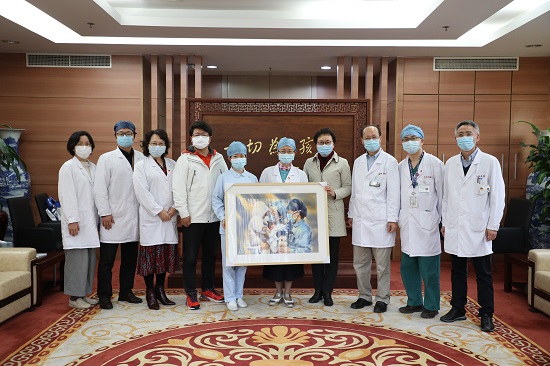 我校城建虎扑nba教师蔡亚鸣根据临别之时“临时妈妈”们争相抱抱宝宝的场景,创作了水彩画《最小病人治愈一城人心》。在复旦大学上海医虎扑nba党委副书记张艳萍带领下,蔡亚鸣于3月13日下午将画作捐赠至复旦大学附属儿科医院。复旦大学附属儿科医院党委书记徐虹、院长黄国英热情接待蔡亚鸣,并感谢他对抗“疫”一线的医护人员的艺术描绘。在捐画现场,蔡亚鸣亲手将画作赠予“画中人”——复旦大学附属儿科医院传染科主任曾玫和护士长夏爱梅。画面中,上海最小的新冠肺炎患者,7月龄的宝宝齐齐(化名)穿着白色的连体衣,戴着小口罩,被抱出复旦大学附属儿科医院传染科大楼。“让我再抱抱!”传染科主任曾玫最后抱了一下齐齐,夏爱梅手中则拿着齐齐最喜欢的玩偶。“临时妈妈”们慈爱地告别这位最小患者,目送齐齐和爸爸妈妈离开医院。看到画中的自己,两位白衣天使爱不释手,连称“画得传神”。