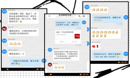 校党委学生工作部部长袁翔受邀参加该支部主题党日活动,亲临线上交流平台,观看学生上传的录制视频,聆听学生的肺腑感言,对支部活动形式予以充分肯定,对学生党员责任意识的提升予以赞许,叮咛并勉励大家:特殊时期,服从命令听指挥,居家防“疫”不停学,耐心等候开学佳音。