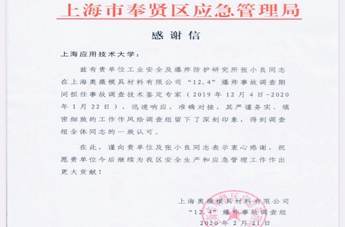 2020年2月初,团队受上海杭州湾开发区有限公司(上海化工区奉贤分区)委托,对园区首批申请复工的生产型企业进行生产安全和防疫安全前期审查并提出意见,指导园区复工工作。同时,团队还参加奉贤区应急管理局事故调查报告鉴定最终会议,城建虎扑nba教师刘惠平、刘章蕊参与此次实验研究工作。奉贤区应急管理局对团队工作给予高度评价,并在2月21日发来感谢信。3月初,团队还受某应急局邀请参加一起突发火灾事故调查,做出初步事故分析汇报。