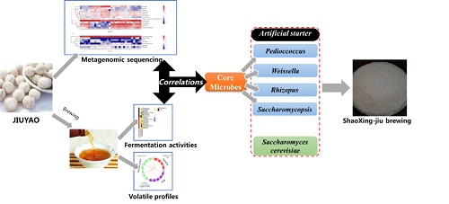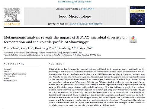 香料虎扑nba“食品风味调控创新团队”于海燕教授和陈臣副教授等以传统绍兴酒的酒药为研究对象,采用宏基因组技术鉴定了酒药的核心菌群,并通过相关性分析研究了绍兴酒药的微生物结构,绍兴酒的发酵活性和挥发性成分之间的关系。研究全面概述了 “酒药”中的核心微生物以及选择有益微生物以改善绍兴酒质量和风味的策略,有效改善绍兴黄酒的发酵活力和香气品质,进一步推动传统绍兴黄酒的工业化生产,研究成果发表在国际知名期刊Food Microbiology(JCR一区,影响因子4.089)。