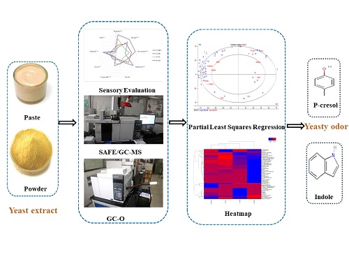宋诗清副教授指导的18级研究生汪卓琳采用GC-O、感官分析和偏最小二乘回归(PLSR)分析相结合,鉴定出四种酵母提取物的不同风味物质。研究发现,对甲酚和吲哚具有酚味和动物味,是引起酵母提取物异味(酵母味)的重要原因。更重要的是,吲哚是首次报道对酵母味具有重要的作用。该文章发表在美国ACS期刊Journal of Agricultural and Food Chemistry(JCR一区,影响因子3.571),该工作对进一步解决酵母异味的问题奠定了理论基础。