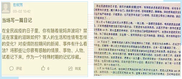 “‘宅’家抗疫,家人的生活和性情有什么影响?对疫情防控期间的新闻、事件有什么看法?……请你将那些让你很有感触的情景、事物、人物试着记下来,作为一个特殊时期的记忆珍藏。”通过问题设定,包老师的纲要在线课,就成了日记撰写、评说、分享课。
