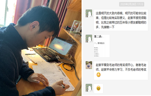 毛奕涛同学是光电信息科学与工程专业的大四学生党员,也是“沛霖”志愿者辅导队的一员。毛奕涛辅导的是湖北省天门市第一小学五年级的赵紫芊。2月28日以来每天辅导两小时。有人问他苦不苦,他说“如果能帮助到有困难的湖北小朋友,这点辛苦不算什么,这是一位党员的责任,我感到十分荣幸”。